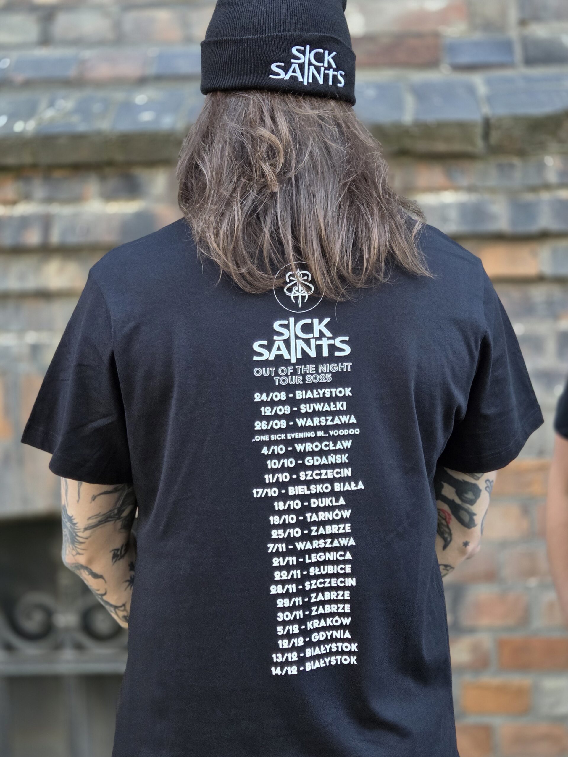 Black, unisex t-shirt, 100% cotton, featuring OUT OF THE NIGHT cover art on the front, and FULL AUTUMN SAINTS 2025 TOUR SCHEDULE on the back..